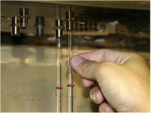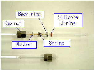 Set connecting caps at the both ends of the glass column. If using a silicone O-ring (under 250 deg.C), set the pieces in the following order: cap nut, washer, spring, back ring, silicone O-ring. The larger side of the back ring should face the silicone O-ring.