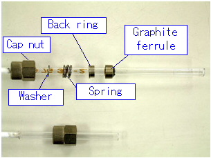 If using a graphite ferrule (for over 250 deg.C), set the pieces in the following order: cap nut, washer, spring, back ring graphite ferrule. The smaller side of the back ring should face the graphite ferrule.