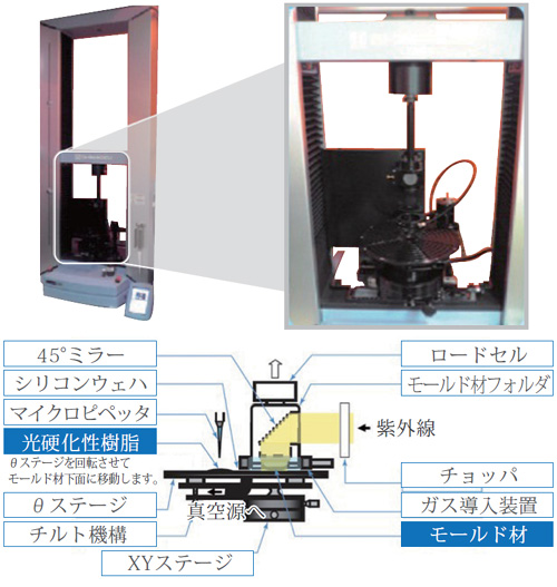 本系统可测量模型材料表面与光硬化性树脂的表面剥离数据。极具优势的细微加工法——光学纳米压印光刻技术运用接触型造型法,可将拥有细微凹凸的模型从光硬化性树脂表面剥离。这种技术可用于分析剥离工艺,延长模型寿命,以及新的开发研究。系统含有模型定位台、紫外线照射用光学系统、剥离评测夹具,可在接近实际工艺的状态下,测量模型材料表面与经紫外线光照射而硬化的光硬化性树脂表面的剥离力。 ※本系统系与东北大学共同研发。
