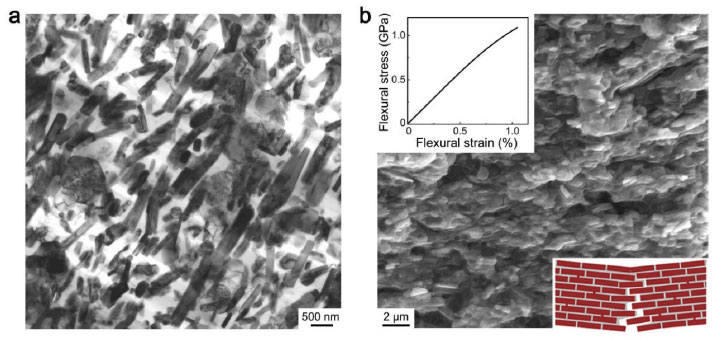 近日,中国科学院金属研究所仿生材料研究团队与轻质高强材料研究部及国内外科研人员合作,选用兼具金属和陶瓷特性并且与镁界面润湿性良好的MAX相陶瓷作为组元,利用含氧气氛下的可控球磨工艺将MAX相剥离成亚微米尺度薄片,进而利用真空抽滤实现陶瓷薄片的择优定向排列,最后将镁熔体浸渗入部分烧结的多孔陶瓷骨架中,研制了具有超细尺度三维互穿类贝壳结构的新型镁 -MAX相仿生金属陶瓷材料,如图1所示。