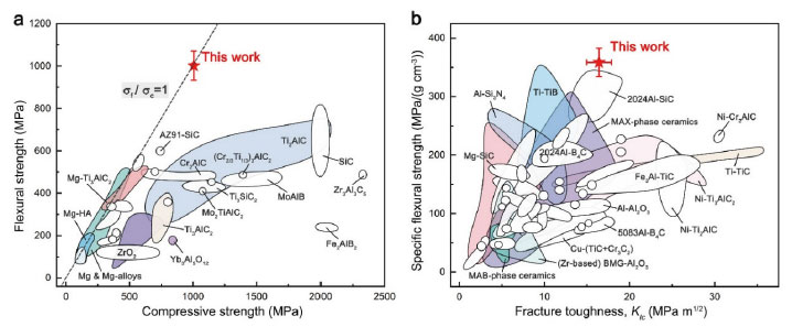 轻质高强韧高阻尼材料对于促进结构减重、保障安全服役,以及提升减振、吸能、降噪等功能至关重要,在航空航天、精密仪器等领域具有广泛应用前景。金属和陶瓷是工程应用最广泛的两类结构材料。陶瓷具有高模量、高硬度、高热稳定性等优点,但断裂韧性和阻尼偏低,力学性能对缺陷较为敏感,特别是在张应力条件下强度明显减弱。与之相比,金属通常表现出更为优异的延展性和断裂韧性,其中镁和镁合金具有突出的比强度、比刚度和阻尼性能,然而,其绝对强度、刚度以及断裂韧性均偏低,一定程度上限制了它们的广泛应用。