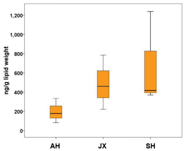 图1 不同地区养殖中华绒螯蟹中SCCPs 污染水平