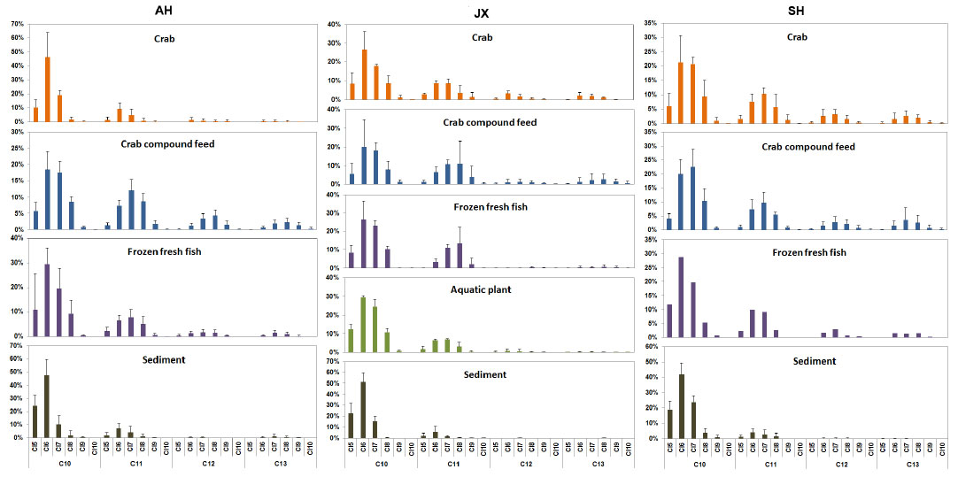 中华绒螯蟹(Eriocheir sinensis)是中国、日本、韩国等亚洲国家的一种重要的养殖水产。2016年,我国淡水中华绒螯蟹养殖产量达81万吨。长江流域作为中华绒螯蟹的主要产区,占我国养殖蟹总量的80%。中华绒螯蟹是两年生底栖水生生物,能够通过饲料、养殖环境等多种途径暴露环境污染物。然而,目前尚无养殖中华绒螯蟹中CPS赋存水平及污染来源的相关报道。本研究通过研究典型中华绒螯蟹养殖区域蟹可食组织及其饲料、养殖环境中氯化石蜡(SCCPs)和中链氯化石蜡(MCCPs)的污染水平和污染特征,分析养殖中华绒螯蟹中SCCPs和MCCPs的主要污染来源。