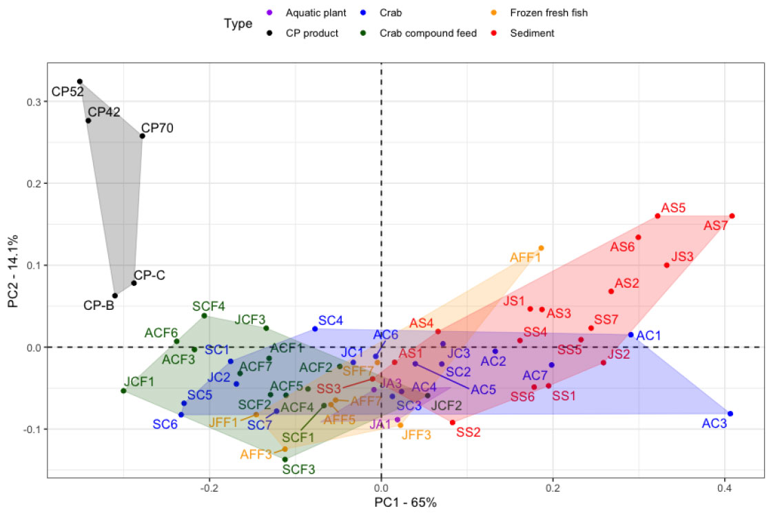 图3 不同地区中华绒螯蟹食物网样品和工业品CPs 中SCCPs 同类物主成分分析图