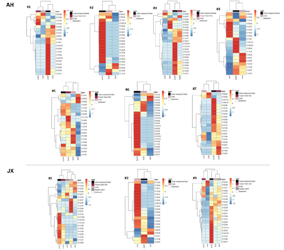 养殖中华绒螯蟹饲料(配合饲料、冰鲜鱼),以及养殖场水生植物和沉积物中SCCPs 均有检出,玉米中未检测到SCCPs。配合饲料中SCCPs 含量为57-747 ng/g,冰鲜鱼中SCCPs 含量为18-191 ng/g ww,水生植物中SCCPs 含量分别为6.5ng/g ww 和23 ng/g ww,沉积物中SCCPs 含量为52-191 ng/g 干重(dw)。中华绒螯蟹饲料及其养殖环境样品中SCCPs同类物分布特征与中华绒螯蟹相似。主成分分析对中华绒螯蟹中SCCPs 污染来源分析表明,养殖中华绒螯蟹食物网中SCCPs 的污染与工业品氯化石蜡并无一定的相关性,不同地区养殖场采集的样品中SCCPs 并无显著的地区差异(图3)。聚类分析表明,不同养殖场中华绒螯蟹SCCPs 的主要暴露途径不同,饲料和沉积物是养殖中华绒螯蟹SCCPs 暴露的主要途径(图4)。整体而言,中华绒螯蟹饲料及养殖环境中MCCPs 含量低于SCCPs。其中,配合饲料中MCCPs 含量为ND‒359 ng/g,冰鲜鱼中MCCPs 含量为ND‒24 ng/g ww,玉米、水生植物和沉积物中MCCPs 含量均低于检出限。因此,无法利用同类物分布特征对中华绒螯蟹中MCCPs 进行溯源分析。