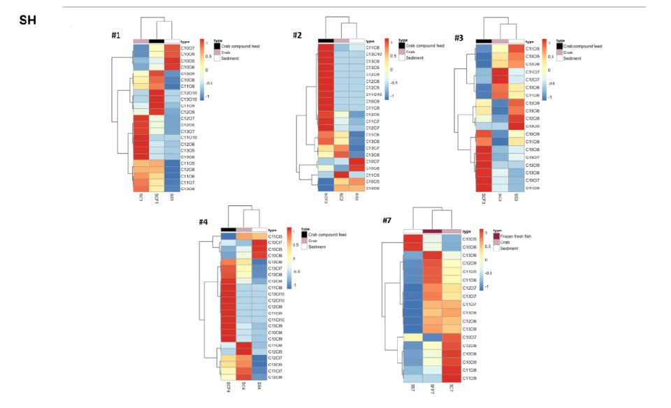 关联机种:GC×GC-qMS,采用岛津全二维气相色谱- 负化学电离源- 三重四极杆串联质谱(GC×GC-NCI-MS/MS, TQ8040)对中华绒螯蟹、蟹配合饲料、冰鲜鱼、玉米、水生植物和养殖场沉积物等样品中的短链氯化石蜡SCCPs(C10-13Cl6-10)和中链氯化石蜡MCCPs(C14-17Cl6-10)进行检测。