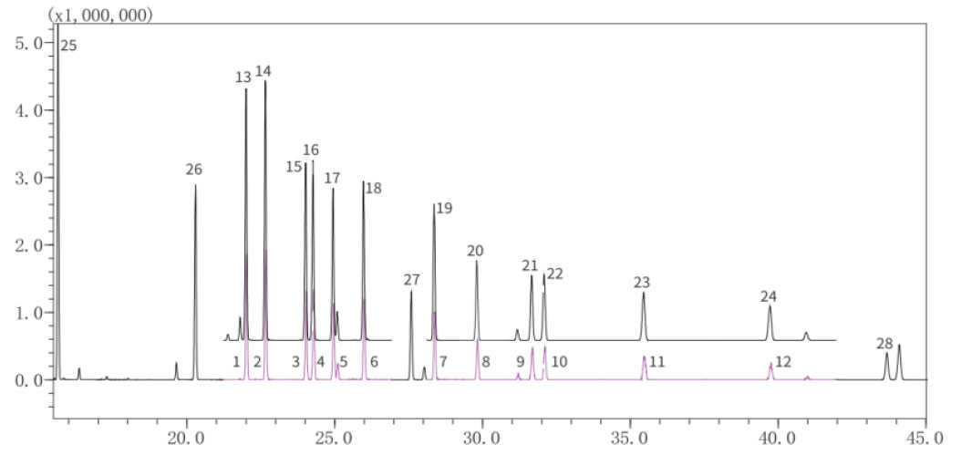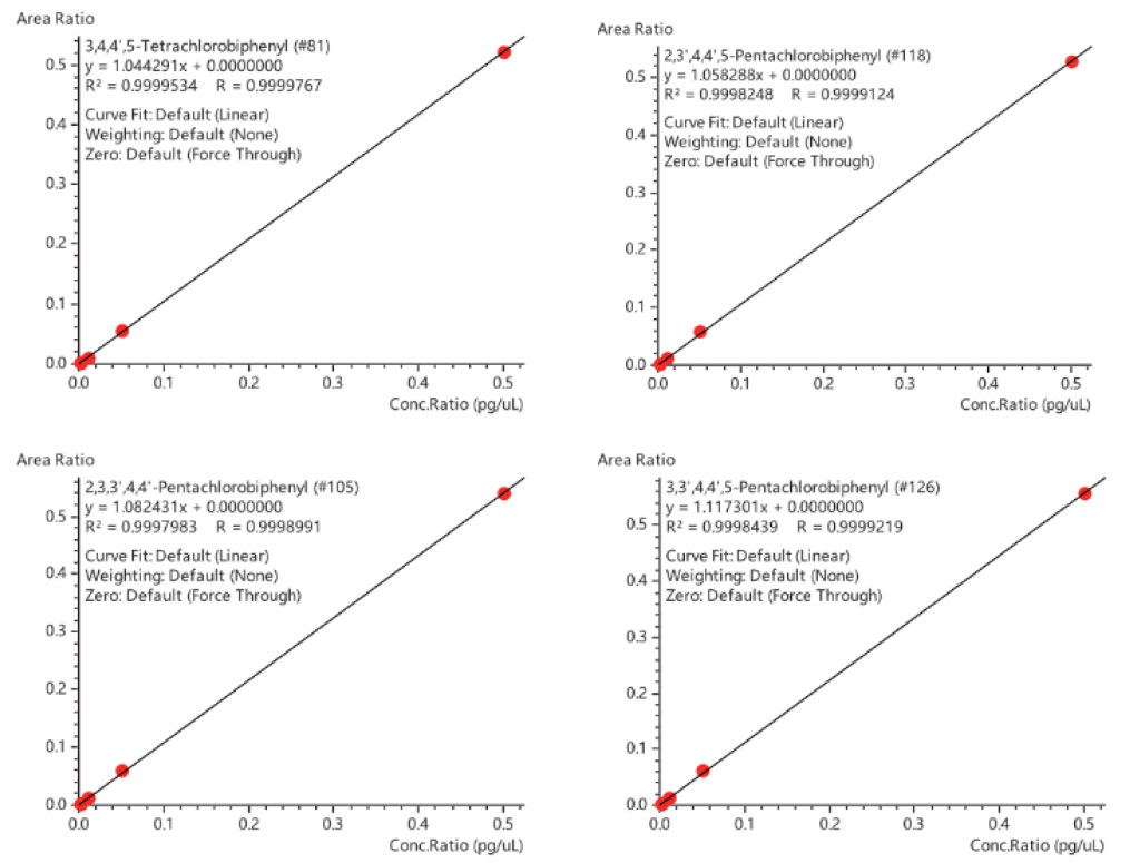 本文介绍了一种气相色谱-三重四极杆质谱法(GC-MS/MS)测定动物源性食品中12种类二噁英-多氯联苯(DL-PCBs)的分析方法。使用岛津 GCMS-TQ8050 NX仪器结合BEIS离子源,使用PCBs Smart Database数据库,建立 12种DL-PCBs分析方法并进行检测,采用13C标记同位素内标法定量。结果表明,12种DL-PCBs分离良好,在标样浓度范围内(0.2~50ng/mL)具有良好的线性(r2 >0.999, RRF RSD%<7.8 %)。利用本方法测定了 2 类动物源性食品(鲱鱼,牛肉)中类二噁英-多氯联苯的浓度,其检测结果与高分辨气相色谱/高分辨质谱法(HRGC/HRMS)结果具有良好的一致性,说明此方法可用于动物源性食品中痕量DL-PCBs的检测分析。