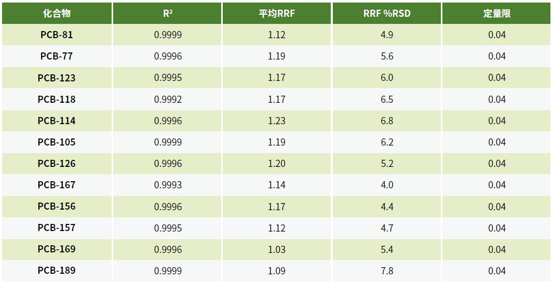 表2 DL-PCBs 校准曲线的相关系数、同系物的平均响应因子和定量限(ng/mL)