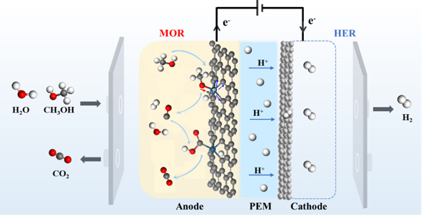 在HT-PEME中,施加电位之后甲醇在Ir-C单原子催化剂上由电促进热催化反应生成H2和CO,之后H2和CO在Ir-C单原子发生氧化反应,阴极发生氢析出反应生成H2。
