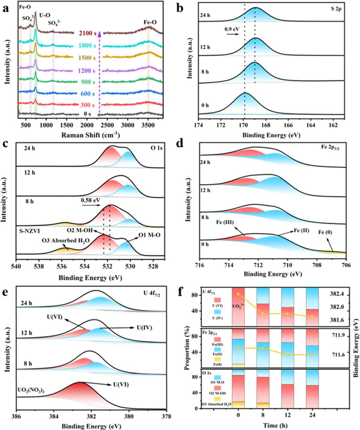 通过准原位XPS分析和电化学原位拉曼,分析了电化学过程中催化剂和吸附铀的界面物种的动态演变过程,研究表明M-SO42-基团和可再生Fe(II)位点分别是UO22+的主要吸附位点和反应位点。