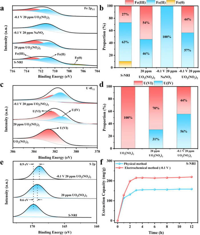 团队通过以S-NRI作为模型催化剂,进一步揭示提铀机制,相关结果表明:Fe(II)可以自发还原U(VI)形成Fe(III)和U(IV),而生成的Fe(III)部分电还原为Fe(II),说明Fe(II)的自发氧化和S-NRI表面的Fe(III)电还原达到了动态平衡,这有利于Fe(II)活性位点的持续再生,维持U(VI)的持续还原。而且Fe-SO42-和UO22+之间强烈的化学相互作用提高了铀酰离子的吸附效率,电化学法铀提取容量和去除率均高于物理化学吸附法,这说明电场促进了Fe(II)活性位点的持续再生和U(VI)的还原。