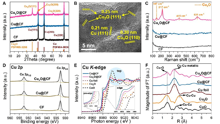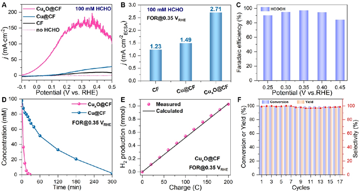 水电解是一种极具前景的制氢技术。然而,由于析氧反应(OER)的高过电位,使得水电解过程电能消耗巨大。与OER相比,有机物的氧化通常表现出较低的反应电位。因此,将有机物氧化反应与析氢反应(HER)相结合,可组成更有优势的制氢系统。然而,大多数有机物的反应电位仍高于1.23 VRHE,显著影响着H2的生成速率。最近,团队通过将生物质衍生醛的阳极氧化和阴极HER过程相结合,开发出一种低电压(~0.1 V)双极产氢电解槽。尽管具有超低的起始电位,但生物质衍生醛仍因其低氢含量而导致相对较高的制氢成本。相比之下,小分子醛如甲醛(HCHO),具有更好的水溶性和更高的氢含量。IB族金属基催化剂可以在超低电位下催化甲醛氧化反应(FOR),其中Cu基催化剂价格低廉,被认为是最佳的阳极候选材料。然而,此前报道的Cu基催化剂很难在大电流密度下稳定运行。同时,低电位FOR的机理和反应途径也很少被研究。在这项工作中,团队设计出一种在泡沫Cu上部分还原的CuO(CuxO@CF)电催化剂,其在FOR中起始电位低至-0.1 VRHE,而在0.35 VRHE时产生H2的最大电流密度为165 mA cm-2。通过原位表征和DFT计算证实了FOR的催化机理和反应途径,并对Cu0和Cu+的存在以及在FOR中的协同作用进行了鉴定和研究。