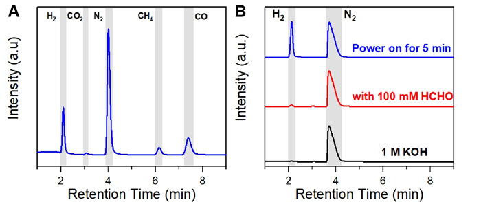 团队利用GC对反应过程中的气相产物进行了定性与定量分析,确定了其成分为H2且主要来源于电化学反应过程(图4)。
