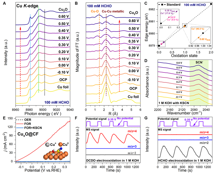 接着,团队利用原位同步辐射吸收谱、原位红外结合毒化实验和原位微分电化学质谱共同证实了Cu0和Cu+活性位点在FOR过程中存在且具有协同效应(图7)。