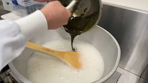 - 将煮好的坯料加入红富贵茶,搅拌煮制至完成。