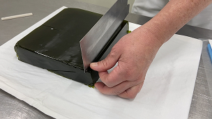 - 将凝固的底料用刀均匀地切成薄片(此时质地为果冻状)。