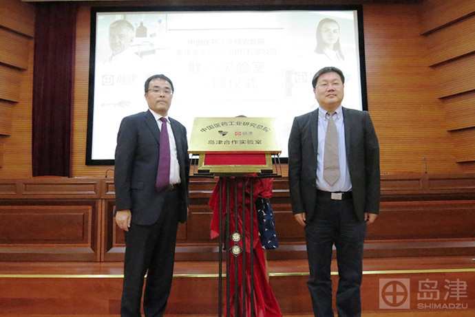 中国医药工业研究总院陆伟根副院长和岛津分析计测事业部吴彤彬事业部长分别发表致辞 至此结束后,两人一起上台为合作实验室揭牌,标志着中国医药工业研究院—岛津企业管理(中国)有限公司联合实验室正式成立!