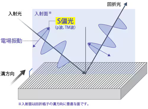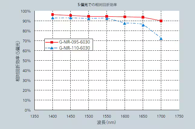 岛津衍射光栅在近红外领域的S偏光(参照下图)中有着极高的相对衍射效率。
